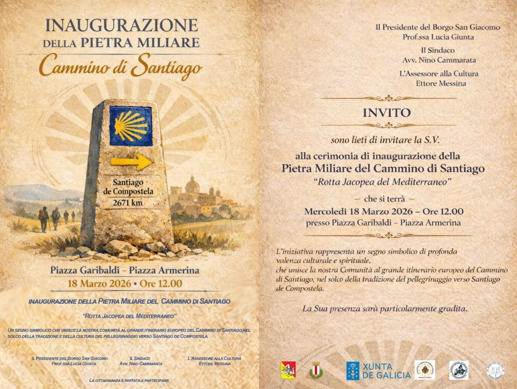 Il prossimo 18 marzo alle ore 12, a Piazza Armerina, sarà posta la pietra miliare del cammino di Santiago “Rotta Jacopea del Mediterraneo”. La pietra è posta nella centralissima piazza Garibaldi della Città dei Mosaici. Il simbolo universale del pellegrinaggio verso Santiago de Compostela trova casa nel centro Sicilia, segnando ufficialmente la distanza: 2671 km di fede, cultura e cammino che uniscono la Sicilia all’Europa e vuole essere un segno simbolico che unisce il cammino di Santiago in Sicilia al grande itinerario europeo del Cammino di Santiago di Compostela.