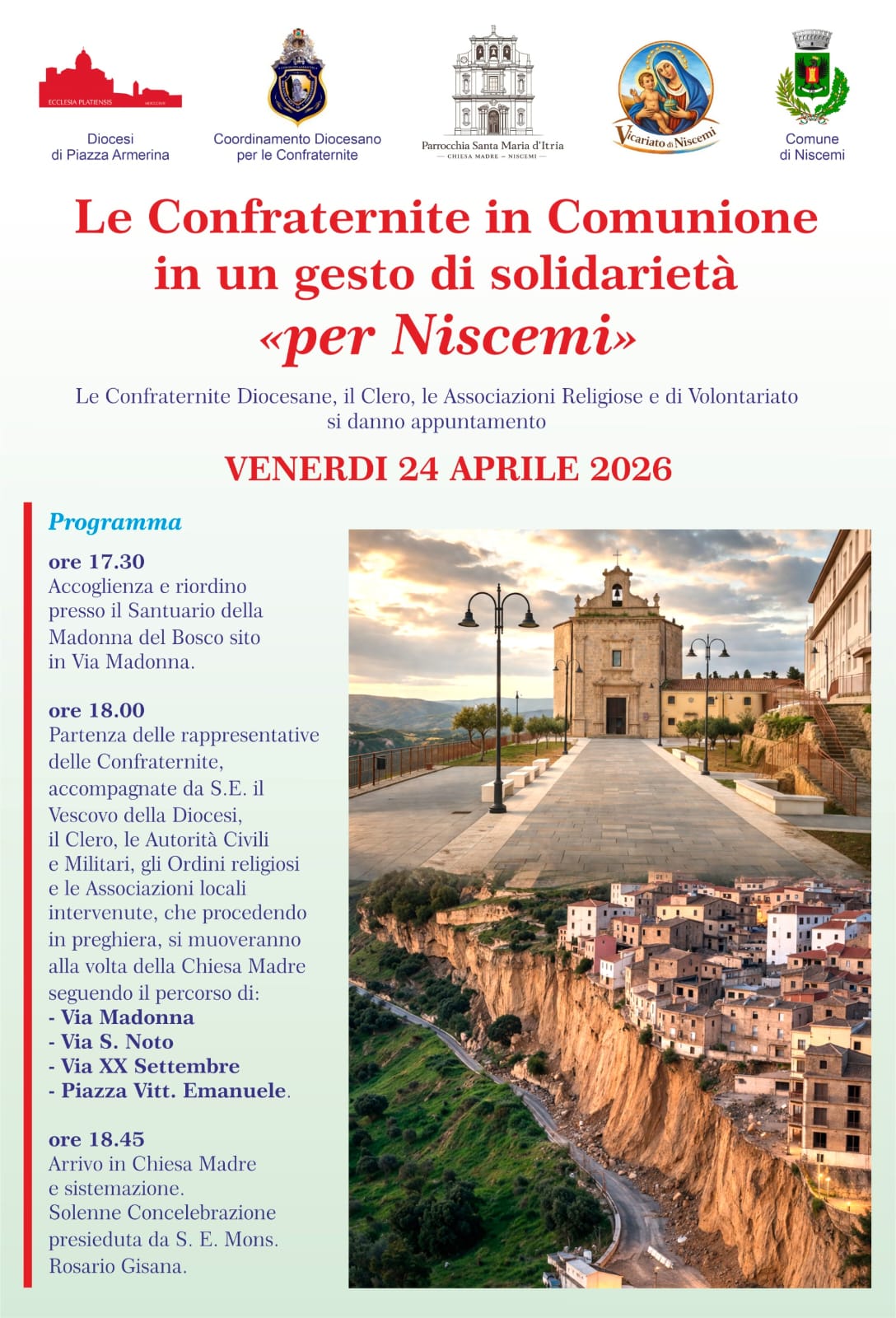 “Le confraternite della Diocesi insieme vescovo mons. Rosario Gisana, – dice don Valerio Sgroi delegato vescovile – desiderano con semplicità ed umiltà camminare accanto ai nostri fratelli e sorelle di Niscemi, incoraggiandoli con la nostra presenza, sostenendoli con la nostra preghiera e, ove possibile, aiutandoli nei loro bisogni secondo quanto le nostre disponibilità ci consentiranno affinchè il nostro gesto di carità