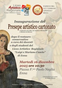 Si è tenuta, martedì 16 dicembre, giorno di inizio della novena di Natale, l’inaugurazione dello storico presepe artistico cartonato della parrocchia san Tommaso apostolo di Enna. Il presepe, composto da 5 cornici artistiche e 4 sagome a grandezza naturale, è stato realizzato nel 1989 dagli artisti locali Mimmo la Bianca e Gaetano Mirisciotti. Da qualche […]