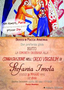 Il prossimo 31 magio, festa della Visitazione della Beata Vergine Maria, in Cattedrale alle ore 18, Stefania Imola si consacra secondo il rito dell’Ordo Virginum. Sarà il vescovo mons. Rosario Gisana a presiedere la Celebrazione Eucaristica. L’Ordo Virginum è l’antico “ordine delle Vergini” e non è una nuova forma di vita religiosa, anzi si può […]