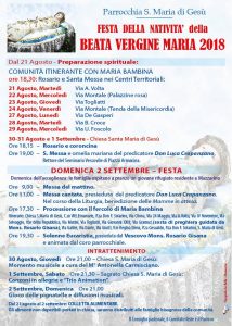 La parrocchia Santa Maria di Gesù di Mazzarino, si appresta a celebrare la festa della natività della Beata Vergine Maria il prossimo 2 settembre. La festa è preceduta da una preparazione spirituale iniziata lo scorso 21 agosto con il rosario e la celebrazione della Messa nei centri territoriali della parrocchia. Un triduo avrà luogo nei […]