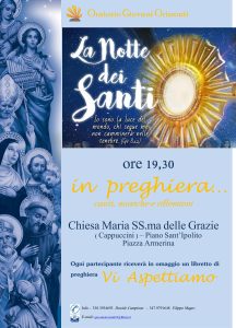 Mercoledì 31 ottobre nella chiesa della Madonna delle Grazie a Piazza Armerina, alle ore 19.30 avrà luogo la Veglia di preghiera nella “Notte dei Santi”. La Veglia è organizzata dall’oratorio dei Giovani Orizzonti. Ogni partecipante riceverà in omaggio un libretto di preghiere.